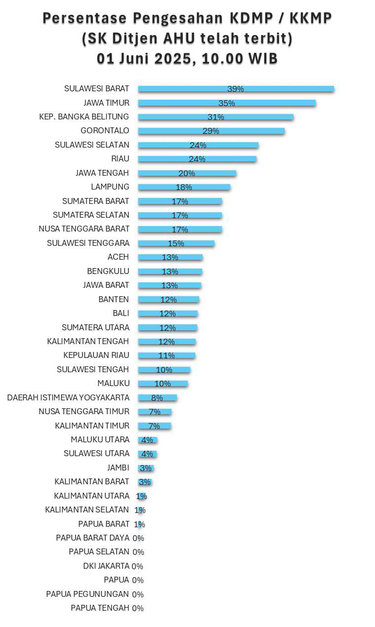 Mamuju,Baleonews.com- Provinsi Sulawesi Barat mencatat tonggak penting dalam upaya pemberdayaan ekonomi desa. Berdasarkan data resmi yang dirilis Direktorat Jenderal Administrasi Hukum Umum (Ditjen AHU) Kemenkumham RI per pukul 10.00 WIB, Minggu, 1 Juni 2025, Sulbar menempati posisi teratas dalam persentase pembentukan dan pengesahan Koperasi Desa/Kelurahan Merah Putih (KDMP/KKMP) secara nasional.
